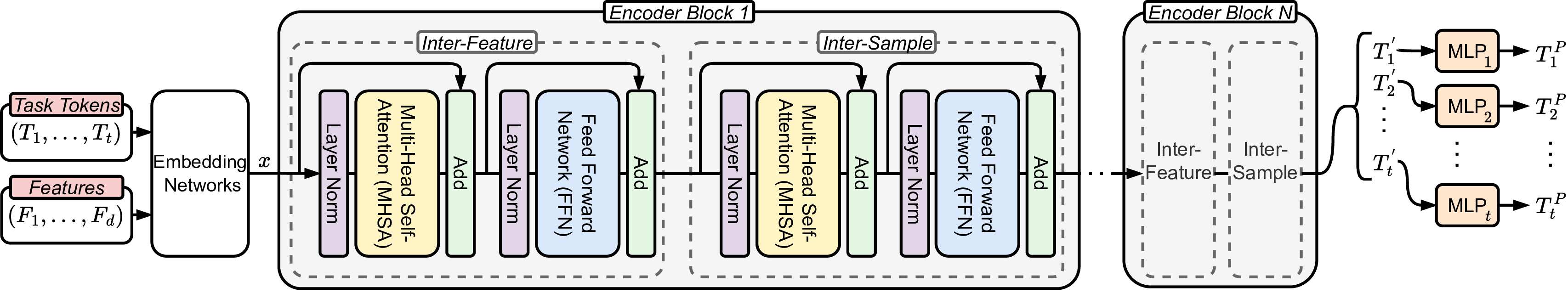 A framework for multitask learning on large tabular data, comprising MultiTab-Net, a transformer-based architecture that models feature dependencies while mitigating task competition, and MultiTab-Bench, a synthetic multitask generator for systematically evaluating multitask dynamics.